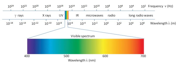Thus, we can find photons of very low frequencies located in the band of radio waves, to photons of very high energy called gamma rays, as shown in the following figure, forming a continuous frequency range that constitutes the electromagnetic spectrum. Since the photon can be modeled as a sinusoid traveling at the speed of light c, the length of a complete cycle is called the photon wavelength λ, so the photon can be characterized either by its frequency or its wavelength, since λ=c/ν. But it is common to use the term color as a synonym for frequency, since the color of light perceived by humans is a function of frequency. However, as we are going to see, this is not strictly physical but a consequence of the process of measuring and interpreting information, which makes color an emerging reality of another underlying reality, sustained by the physical reality of electromagnetic radiation.