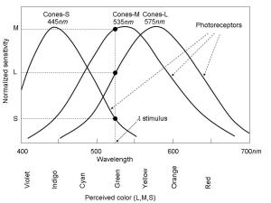On the other hand, the existence of three types of photoreceptors in the human retina makes it possible to synthesize the chromatic range in a relatively precise way, by means of the additive combination of three colors, red, green and blue, as it is done in the video screens. In this way, it is possible to produce an L,M,S response at each point of the retina similar to that produced by a real stimulus, by means of the weighted application of a mixture of photons of red, green and blue wavelengths.